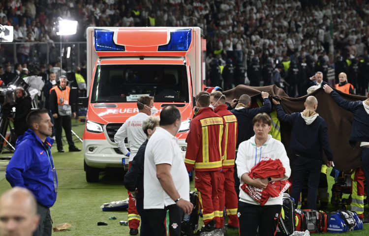 Einer der Fotografen am Spielfeldrand soll einen Herzstillstand erlitten haben. Die Szenen erinnern an die EM 2021, als Christian Eriksen auf dem Platz zusammenbrach!